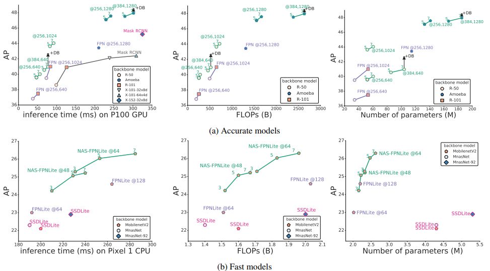 图 9:检测准确率和推理时间的折衷(左)、浮点数(中)、参数(右)。(a)研究者将其与其他高准确率模型进行了对比。所有模型的推理时间都是在一个搭载 P100 GPU 的设备上计算出来的。绿色折线显示的是拥有不同骨干架构的 NAS-FPN 结果。该标记上的数字表示在 NAS-FPN 中金字塔网络的重复次数。在每个数据点旁边都表明了 NAS-FPN/FPN 的特征维数和输入图像大小。(b)研究者将自己的模型与其他快速模型进行了对比,其中所有模型的输入图像大小为 320x320,推理时间是在 Pixel 1 CPU 上计算的。本文中的模型是用 MobileNetV2 的轻型模型训练的。
