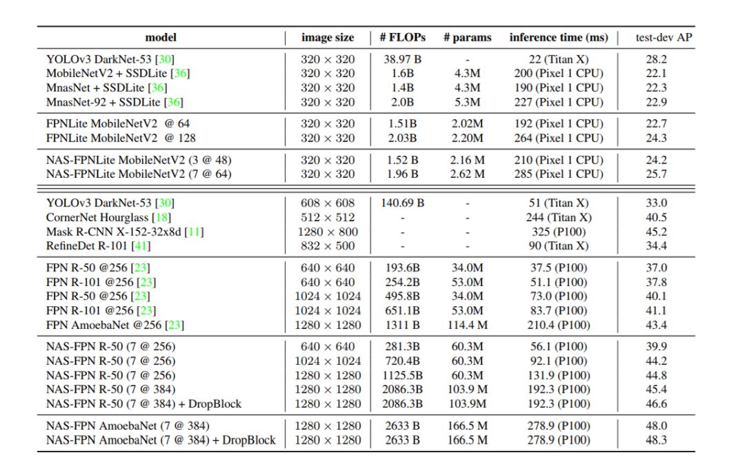 表 1:NAS-FPN 和其他当前最优检测器在 COCO 测试数据集上的性能表现。