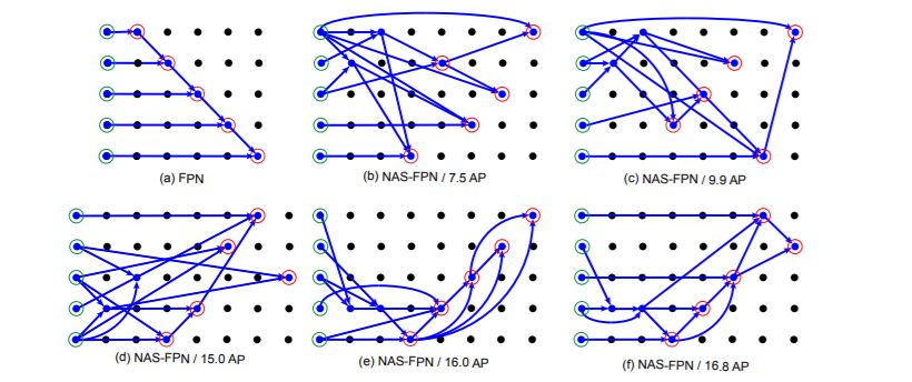 图 7:NAS-FPN 的架构图。每个点代表一个特征层,同一行的特征层具有相同的分辨率,分辨率由下往上递减。箭头表示内层之间的连接,该图的结构是输入层位于左侧。金字塔网络的输入用绿色圆圈标记,输出用红色圆圈标记。(a)基线 FPN 架构。(b~f)在 RNN 控制器的训练中通过神经架构搜索发现的 7-cell NAS-FPN 架构。(f)实验中最后收敛得出的 NAS-FPN。