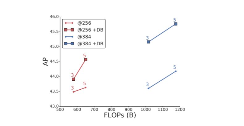 图 10:特征维数为 256 或 384 的 NAS-FPN 在训练时有无 DropBlock (DB) 的性能对比。模型和 ResNet-50 骨干模型在大小为 1024x1024 的图像上训练。当我们在金字塔网络中增加特征维数时,添加 DropBlock 变得更重要。