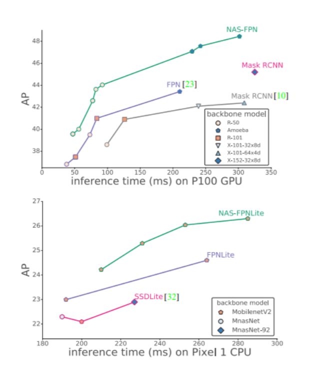 图 1:移动设备上准确型模型(上)和快速型模型(下)的平均精度与推断时间关系。绿色折线是 NASFPN 与 RetinaNet 相结合的结果。详情请看图 9。