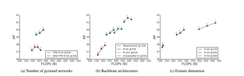 图 8:NAS-FPN 的模型容量。(a)叠加金字塔网络,(b)改变骨干架构,(c)增加金字塔网络中的特征维度。所有的模型都是在 640x640 的图像大小上训练/测试的。标记上方的数字表示在 NAS-FPN 中金字塔网络的数量。