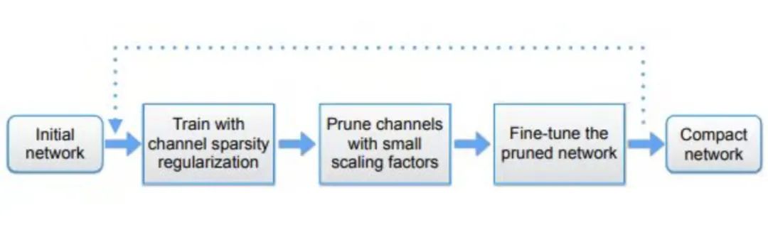 由于最终推理设备是cpu,所以对模型的轻量化要求较高,未经优化的yolov5s的推理速度越10FPS+,很难达到实时推理,所以我们对yolov5s网络进行剪枝,方法参考了slim-yolov3,通过bn层缩放系数,对模型各层的通道数进行结构化剪枝。剪枝的原理和操作流程如下: