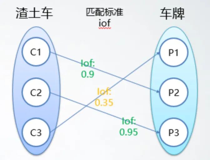 由于检测网络同时输出渣土车和车牌的bbox,丢失了两者的关联关系,所以我们使用匈牙利算法对两者进行匹配,获得每个渣土车目标对应的车牌bbox。匹配的cost使用的是IoF,即Intersection over foreground,车牌即为foreground。理论上,车牌对于其所在的渣土车的IoF应该为1,实际匹配中我们设置了一个更宽松的阈值0.8。主要处理流程如下: