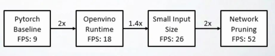 优化后模型的推理速度从9FPS最高到52FPS,已具备CPU上实时推理的能力。
