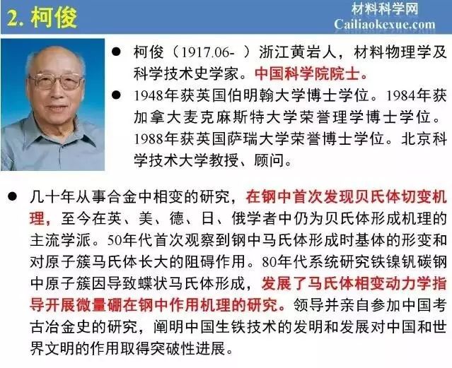 柯俊先生(1917.6.23)是国际著名金属物理学家、科学技术史学家和教育家,由于在奥氏体中温转变—贝氏体方面的学术成就,被国际同行称为贝茵体先生(Mr.Bain)。半个多世纪以来,他奋斗在冶金、材料科技界、教育界、工业界、考古界,情系矿冶,悉育桃李,成就了辉煌的钢铁人生。
