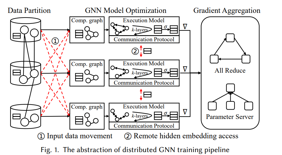 为了更好地理解端到端分布式GNN训练的一般工作流程,我们将训练管道分为数据划分、GNN模型优化和梯度聚合三个阶段。图1可视化了端到端分布式GNN训练工作流的高级抽象。