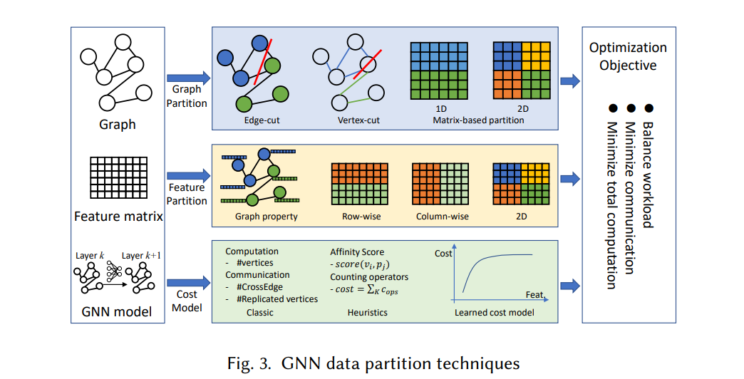 在本节中,我们回顾了分布式GNN训练中现有的GNN数据分区技术。图3描述了这些技术的概述。考虑到图和特征是GNN中两种典型的数据类型,我们将划分方法分为图划分和特征划分。优化目标是工作量平衡、通信和计算最小化,旨在解决挑战#1和#3。此外,成本模型是捕获GNN工作负载特征的另一个关键组件。在下面,我们首先提出了代价模型,然后分别讨论了图划分和特征划分。