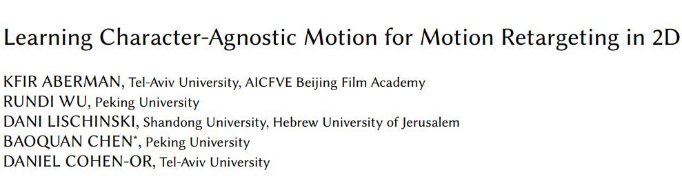 计算机领域规模最大、参与人数最多的顶级会议 SIGGRAPH 2019 将在今夏火热举行。北京大学陈宝权课题组与北京电影学院和山东大学合作共有 3 篇论文获得接收,另有一篇 ACM Transaction on Graphics 录用论文,共 4 篇论文将在 SIGGRAPH 上宣读。本篇为其中的一篇:《Learning Character-Agnostic Motion for Motion Retargeting in 2D》的解读。其他论文解读,敬请关注后续报道。