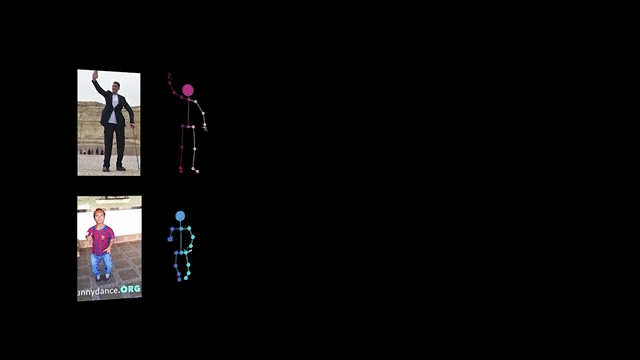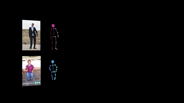 有了骨架上的动作迁移之后,我们可以基于此做图像生成,这就是 performance cloning。之前的 performance cloning 方法大多使用简单的 global scaling 做骨架转换或者需要 3D 的先验知识,因此限制了其应用范围,而我们的方法不受此约束且能够产生更加合理的结果。