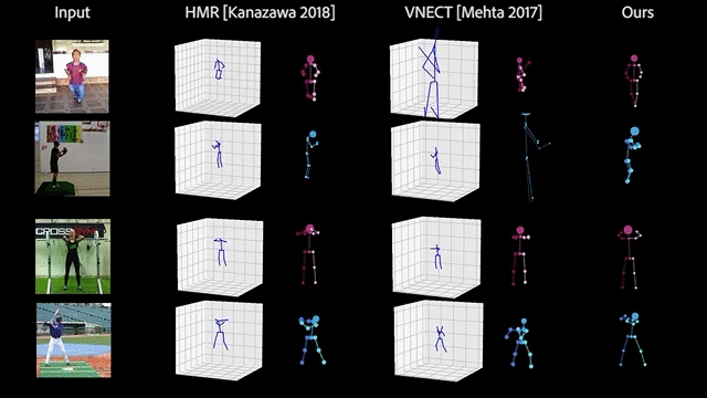 我们将结果与简单的 2D 方法和先前的 3D 方法进行了比较,包括直接在 Mixamo 数据集与 ground truth 的对比和在真实视频上的整个迁移流程的对比。在真实视频的对比上,我们采用 OpenPose 来提取 2D 的人体姿态,用于比较的算法采用 HMR/VNect 3D 人体姿态估计。
