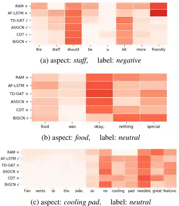 对于第三个句子,集成了语法的方法 TD-GAT,ASGCN 和 CDT 过于依赖解析的结果,将“great” 和 “pad”, “needed” 和 “feature”联系到一起,从而做出了错误的判断。相反地,AF-LSTM 和我们的 BiGCN 通过利用单词共现信息,能够正确地预测 cooling pad 的情感极性。