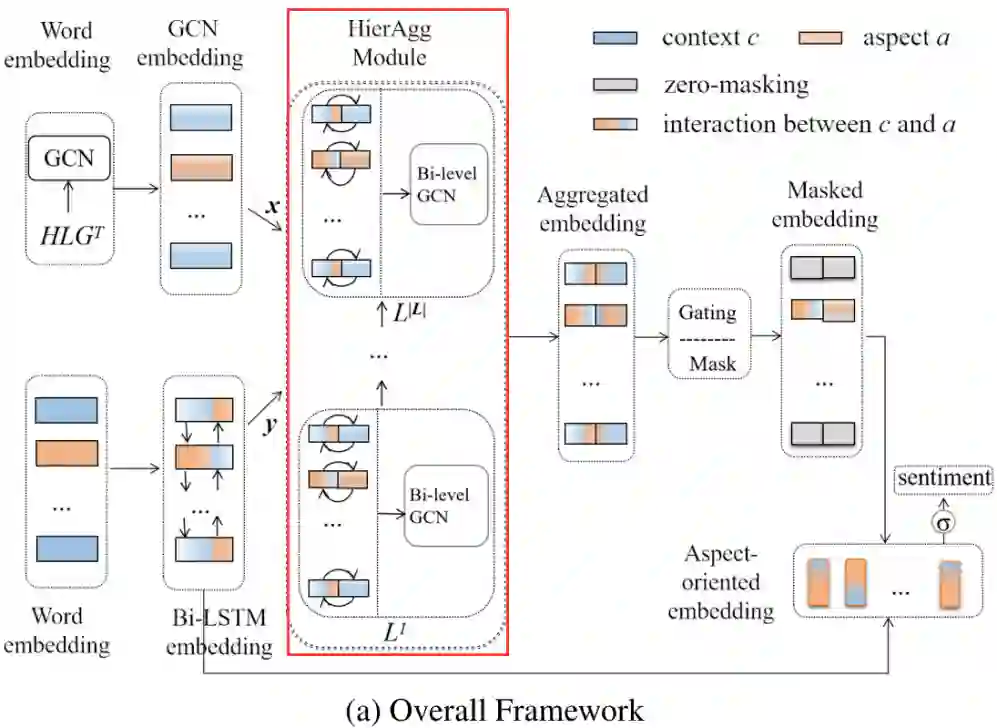 以上述 GCN embedding 和 Bi-LSTM embedding 作为初始句子表示,我们进一步利用局部 层次词汇图 和层次句法图 以获得句子 S 的更好表示。基本思想是让这两个图在经过精心设计的 HierAgg 模块中深入交互。