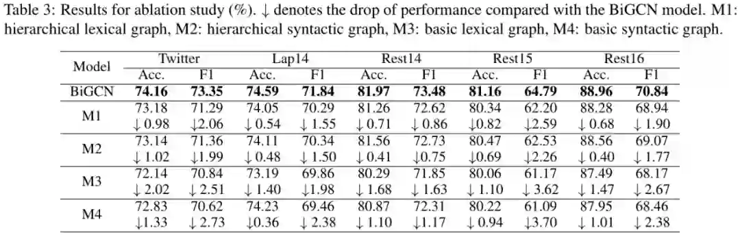 为了检查 BiGCN 模型中每个组件的影响,我们进行了一项分离实验,并将结果显示在表 3 中。我们首先研究局部层次词汇(M1)和句法图(M2)的影响。然后,我们进一步从 M1 和 M2 中删除关系类型来显示概念层次结构的影响,从而得到基本的词汇(M3)和句法图(M4)。表 3 的结果清楚地证明了我们提出的概念层次和词汇图的有效性。