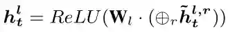 将所有虚拟节点及其特定关系聚合在一起。使用平均聚合函数针对不同关系类型(虚拟节点)更新目标词 t 的表示形式: