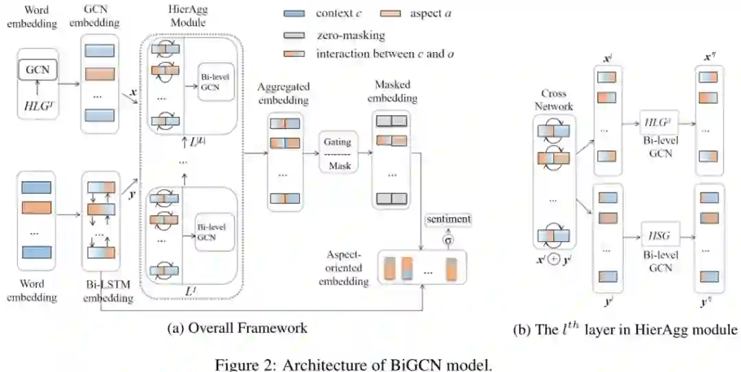 HierAgg 是一个多层结构,其中每层包括一个交叉网络以融合 GCN 和 Bi-LSTM embedding,以及一个双层 GCN 以在层次句法和局部层次词汇图上进行卷积。多层结构确保了在不同级别执行的不同类型信息的协作。本节详细介绍了 HierAgg 中的一层,如下图所示。