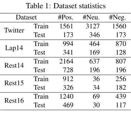 我们在五个基准数据集上评估了我们提出的模型。一种是 Twitter 数据集。它由推特帖子组成。其他四个数据集(Lap14,Rest14,Rest15,Rest16)全部来自 SemEval 任务,其中包含有关笔记本电脑和餐厅的评论,其统计信息如下表 1 所示。