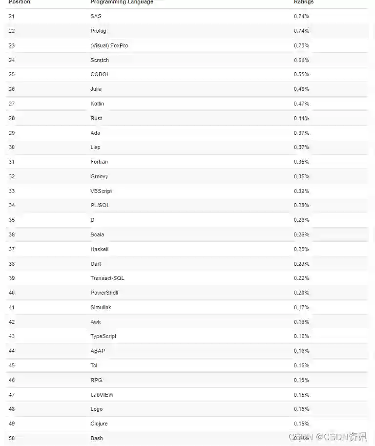 以下语言列表表示#51 到#100。由于差异相对较小,下面的编程语言按字母顺序显示: