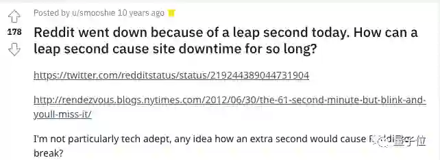 2012年Reddit一次系统崩溃就因闰秒而起,时长超半小时。一组运行开源Linux操作系统的机器未能正确处理增添的闰秒,导致一连串服务器停止运行。