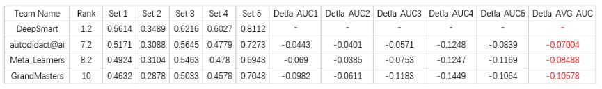 从表格中也可以观察到 Feed-Back 的 5 个任务的平均 AUC 排名和 Blind-Test 基本保持一致,如果 Top 队伍能够获得得分最终 Blind-Test 榜单很可能会有巨大变化。