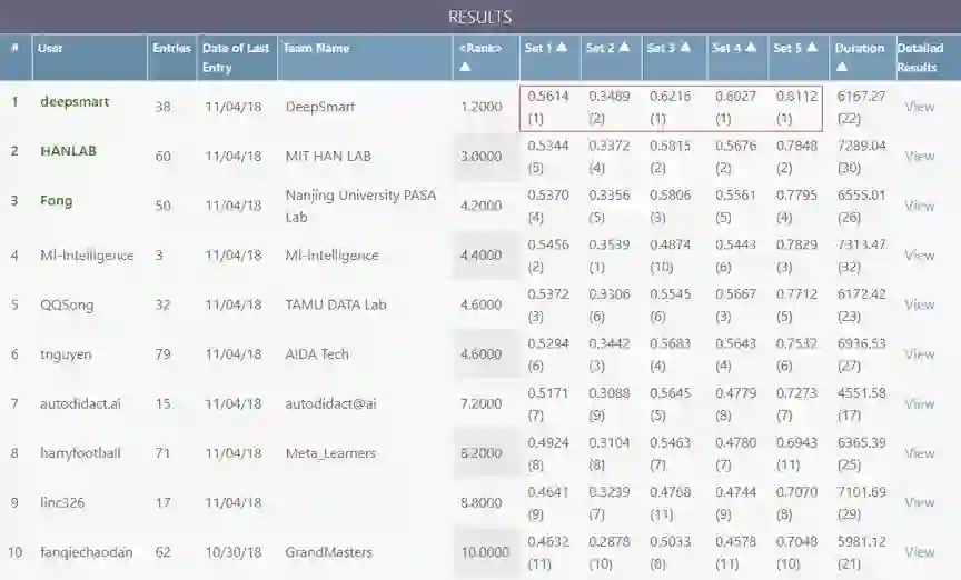近日,由第四范式、ChaLearn、微软和阿卡迪亚大学联合举办的 NeurIPS 2018 AutoML 挑战赛公布了最终结果:Feed-Back 阶段由微软与北京大学组成的 DeepSmart 团队斩获第一名,由 MIT 和清华大学组成的 HANLAB 斩获第二名,由南京大学 PASA 实验室斩获第三名。在 Blind Test 阶段由 Autodidact.ai,Meta_Learners,GrandMasters 斩获前三名。