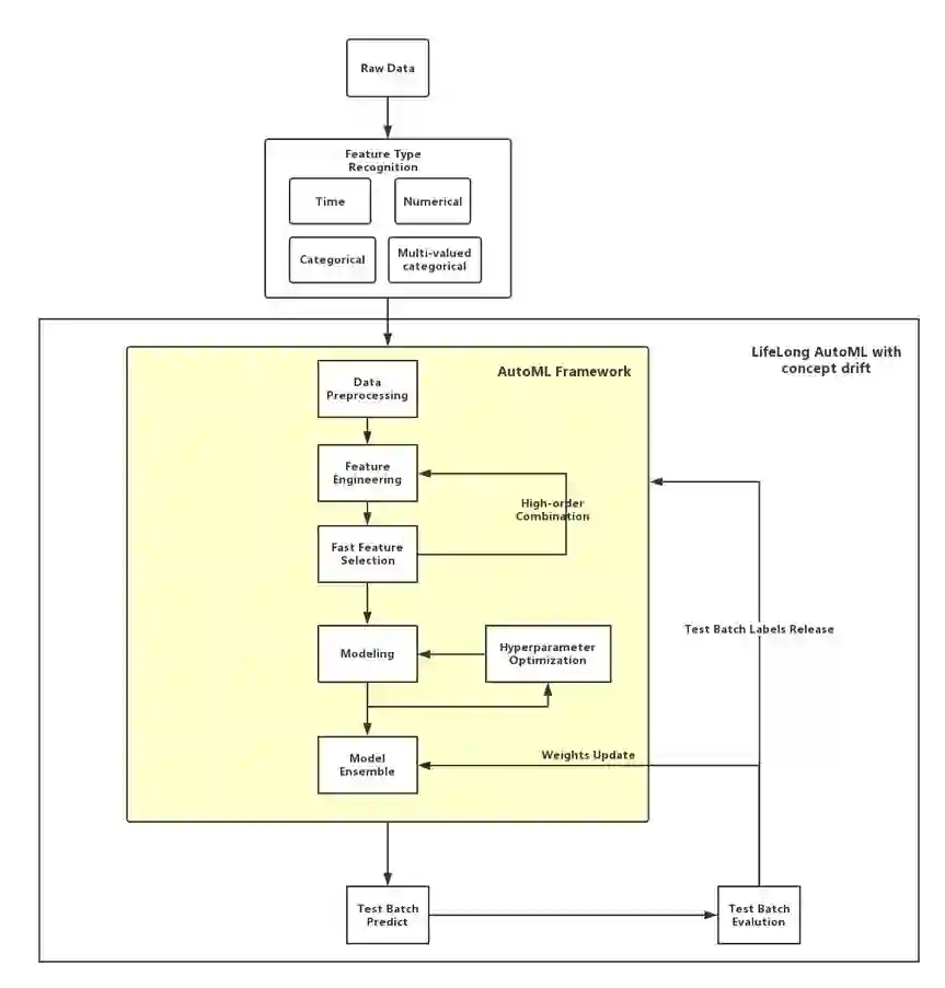 目前,在大部分机器学习工业界应用中,数据和特征对于模型往往是最为关键的。在现有的 AutoML 框架中,大部分特征的提取是通过数值特征进行高阶组合,它们的模型很难提取出跟时序问题或者概念漂移有关的关键特征,然而现实中存在大量的时序问题,而且往往带有概念漂移。