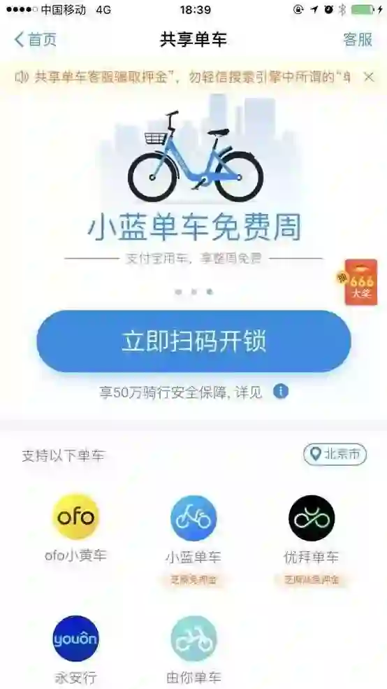 不生产单车,却做着共享单车的生意。据了解,前段时间,支付宝推出了扫码骑车免押金!截止到目前,支付宝已经支持用户免押金畅骑ofo(不免押金)、永安行、小蓝、优拜和由你单车五种单车品牌。