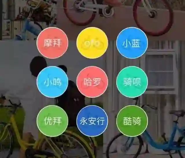 打开APP可看见,目前可用的共享单车有:mobike摩拜单车,ofo共享单车,bluegogo小蓝单车,小鸣单车,Hellobike哈罗单车,QIBEI骑呗单车,优拜,永安行,酷骑9种。