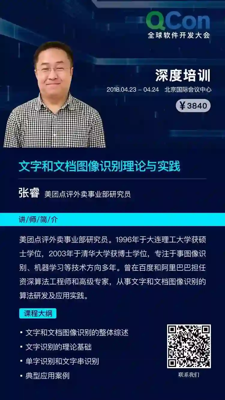 OCR技术在互联网各行业都有广泛的应用,如果你的公司业务中有涉及图像识别和文字识别等业务,那么不要错过本次 QCon北京的深度培训,在 4月 23日 -4月 24日,北京国际会议中心,张睿老师凭借在 OCR领域二十余年的积累,详细的为你介绍从上个世纪以来 OCR技术的整体发展历程并分享众多 OCR领域的案例,答疑解惑。现在报名,享受 8折优惠,立省 768元,更多优惠扫描下方二维码,将立即得到回电。