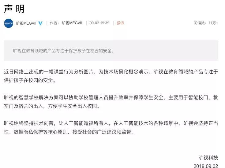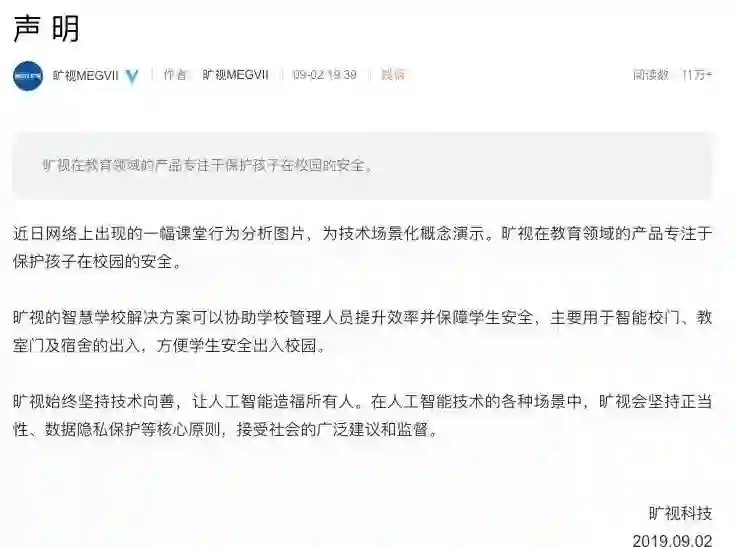 旷视在官方回应中说,自己在教育领域的产品专注于保护孩子在校园的安全。
