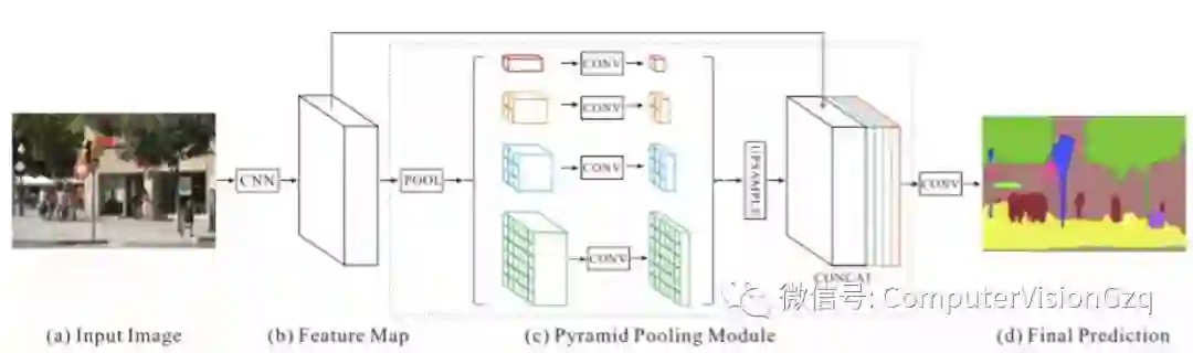 金字塔池化模块通过应用大核心池化层来提高感知域。使用膨胀卷积来修改ResNet网,并增加了金字塔池化模块。金字塔池化模块对ResNet输出的特征进行不同规模的池化操作,并作上采样后,拼接起来,最后得到结果。