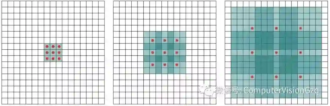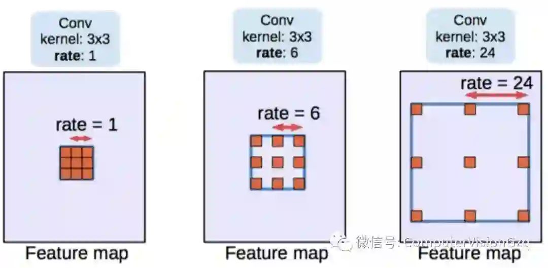 ▪ 第二种是膨胀卷积 (dilated convolutions) 【这个核心技术值得去阅读学习】,抛弃了池化层。使用的卷积核如下图所示: