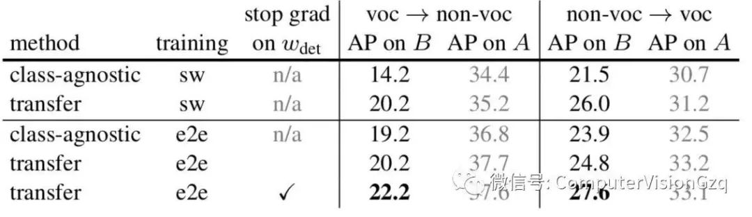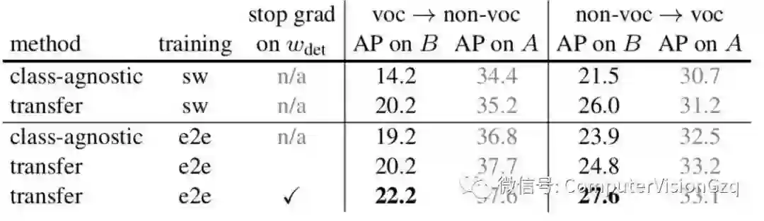 因此,我们也希望以一种端到端的方式,联合训练边界框head和mask head。原则上,可以直接使用A∪B中类的box损失和A中类的mask loss来进行反向传播训练,但是,这可能导致A组和B组之间的类特定检测权重Wc的差异,因为只有c∈A的Wc会通过权重传递函数T(·)从mask loss得到梯度。