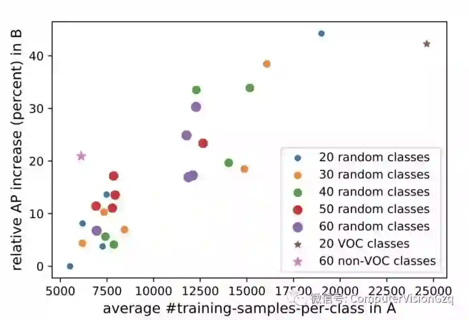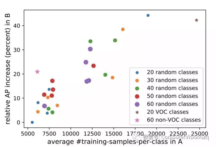 Each point corresponds to our method on a random A/Bsplit of COCO classes.