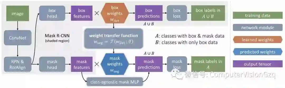 于是,本次放宽了这一要求,而是假设C=A∪B,其中来自A中类别的样本有mask,而B中的只有边界框。由于B类的样本是弱标记的w.r.t.目标任务(instance segmentation),将强标签和弱标签组合的训练作为一个部分监督的学习问题。注意到可以很容易地将instance mask转换为边界框,假设边界框注释也适用于A中的类。