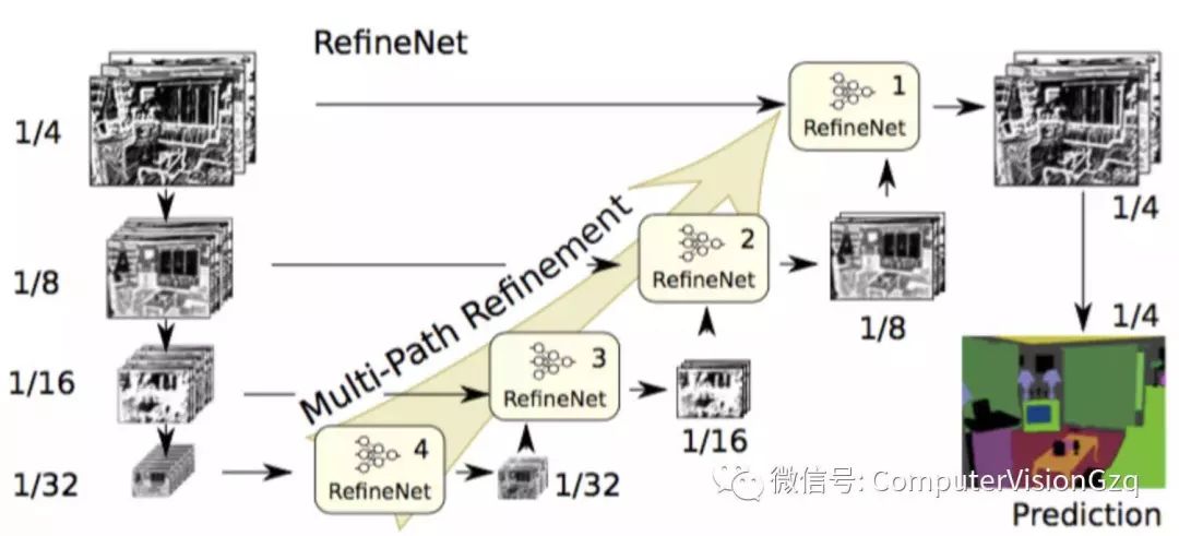 膨胀卷积有几个缺点,如计算量大、需要大量内存。这篇文章采用编码-译码架构。编码部分是ResNet-101模块。译码采用RefineNet模块,该模块融合了编码模块的高分辨率特征和前一个RefineNet模块的抽象特征。每个RefineNet模块接收多个不同分辨率特征,并融合。