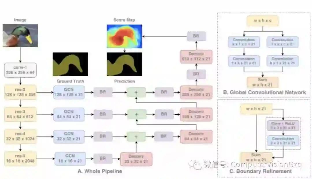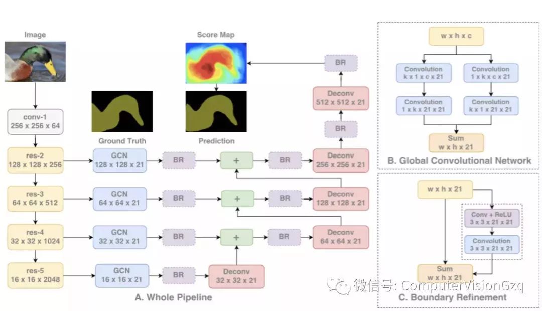 本文的架构是:使用ResNet作为编译器,而GCN和反卷积作为译码器。还使用了名为Boundary Refinement的残余模块。