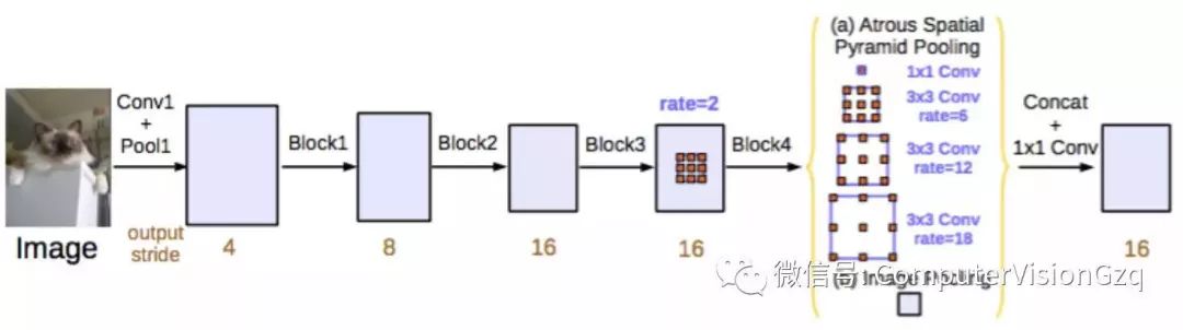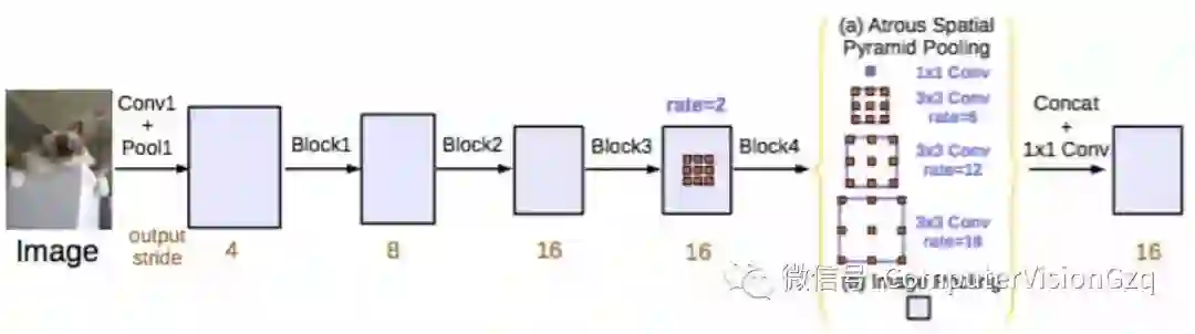 和DeepLab v2一样,将膨胀卷积应用于ResNet中。改进的ASPP指的是将不同膨胀率的膨胀卷积结果拼接起来,并使用了BN 。与Dilated convolutions (2015) 不一样的是,v3直接对中间的特征图进行膨胀卷积,而不是在最后做。