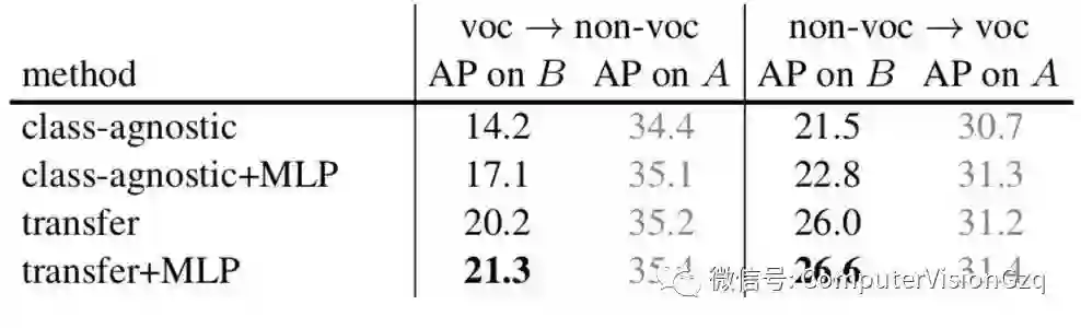 在训练期间,假设对于A和B两组类,instance mask注释仅适用于A中的类,而不适用于B中的类,而A和B中的所有类都有可用的边界框注释。如上图所示,我们使用A∪B中所有类的标准框检测损失来训练边界框head,但只训练mask head和权重传递函数T(·),在A类中使用mask loss,考虑到这些损失,我们探索了两种不同的训练过程:分阶段训练和端到端训练。