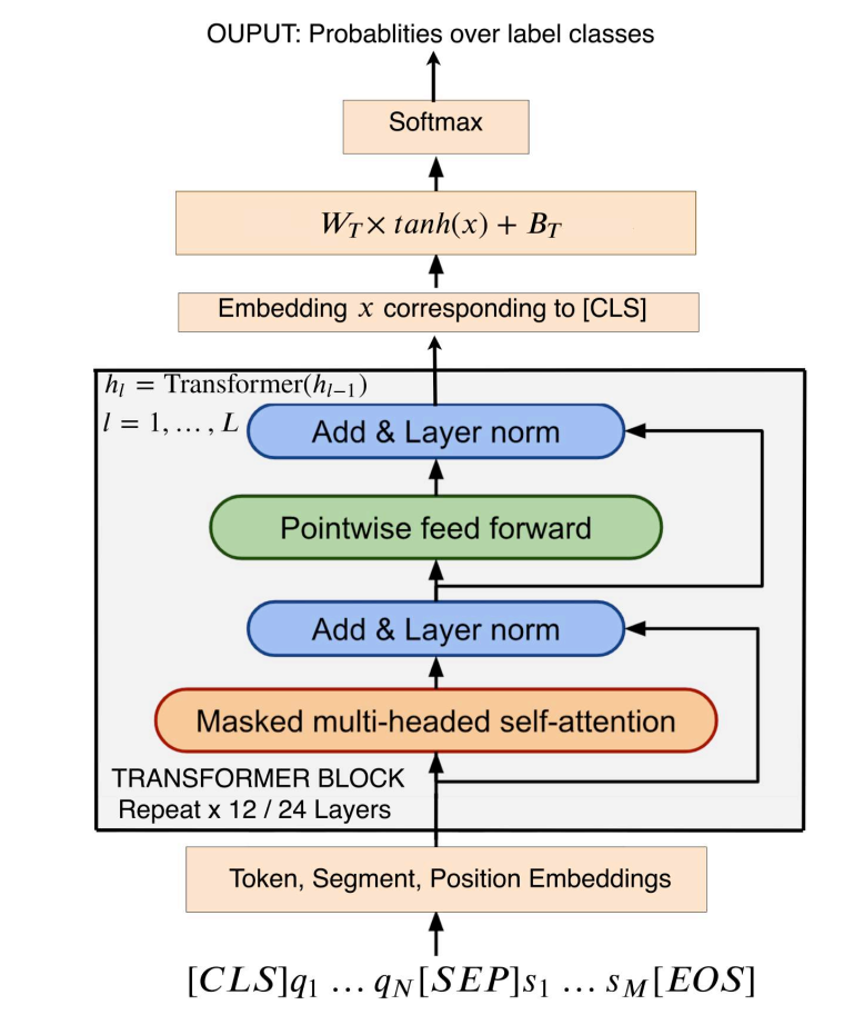 变压器模型的目的是捕获单词间的依赖关系,下图为文本对分类任务的变压器模型架构: