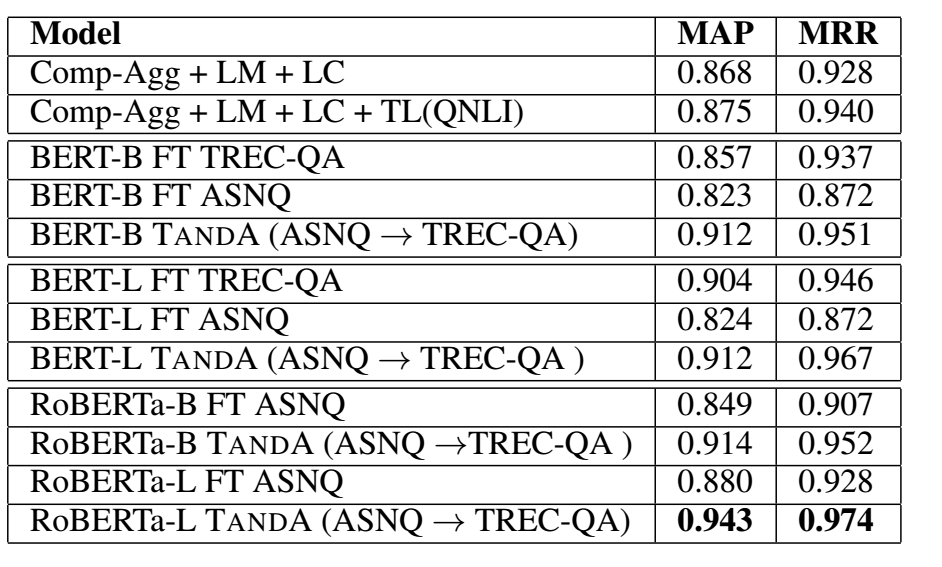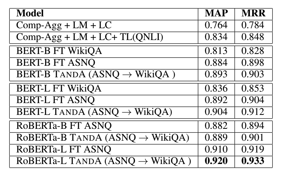 本文的工作将经典的精调(fine-tuning)过程拆成了两次,其中一次针对通用数据集,另一次针对目标数据集,此外,还专门构建了适用于AS2任务的通用数据集ASNQ。本文在两个著名的实验基准库:WikiQA和TREC-QA上进行实验,分别达到了 92% 和 94.3% 的 MAP 分数,超过了近期获得的 83.4% 和 87.5% 的最高分数。本文还讨论了 TANDA 在受不同类型噪声影响的 Alexa 特定数据集中的实验,确认了 TANDA 在工业环境中的有效性。