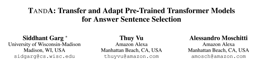 本文提出了一种用于自然语言任务的预训练变换模型精调的有效技术-TANDA( Transfer AND Adapt)。首先通过使用一个大而高质量的数据集对模型进行精调,将一个预先训练的模型转换为一个用于一般任务的模型。然后,执行第二个精调步骤,以使传输的模型适应目标域