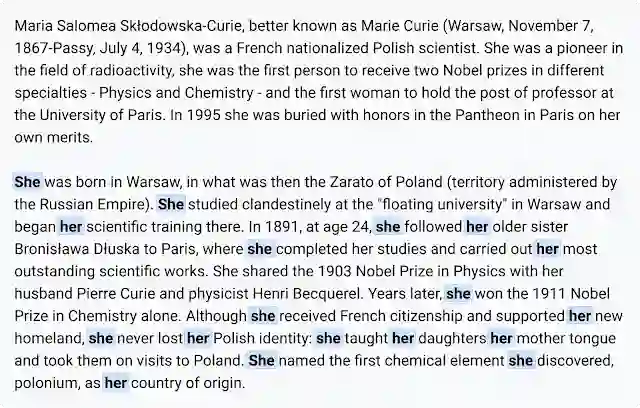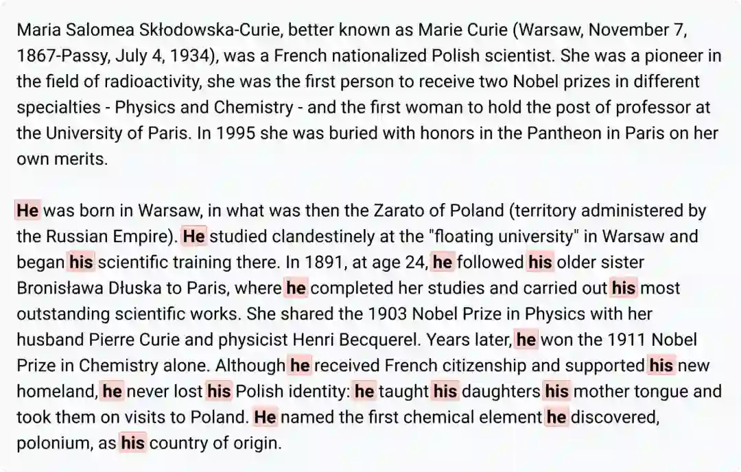 其中一个研究领域是利用句子或段落等上下文,来提高性别表述的准确性。传统 NMT 方法是单独翻译句子,但单独的句子中并不是总能带有对性别信息的明确说明,因此这无疑会带来挑战。例如,在下方西班牙语(该语言并不总是明确提及主语 (Null-subject language))段落中,第一句话明确将 Marie Curie 视为主语,但第二句话没有明确提及主语。孤立来看,第二句话可以指任何性别的人。然而,在翻译成英语时,需要选择一个代词,而翻译准确所需的信息就在第一句话中。