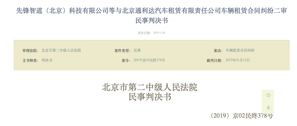 在北京法院审判信息网上,1月24日,铅笔道看到先锋智道(北京)科技有限公司即AA租车,与北京通利达汽车租赁有限责任公司的判决书提到,先锋智道因提前结束了租赁,对方要求赔偿一定损失,双方产生了纠纷。