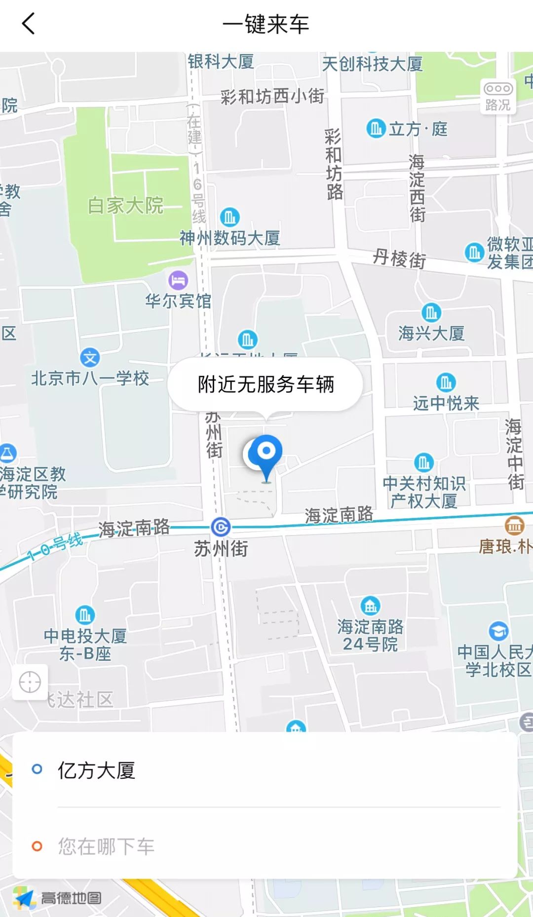 近日,铅笔道记者多次用AA租车App,尝试在北京海淀区中关村附近叫车,地图上始终显示“附近无服务车辆”;在朝阳区北三环安贞门附近,依旧如此。