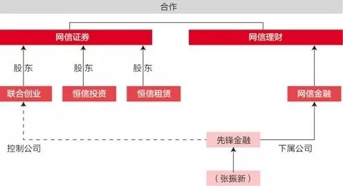 据《21世纪经济报道》在《网信证券携先锋系基因更名,与关联方P2P合作隐藏风险》一文中提到,先锋系旗下有与网信证券同名的网信金融集团。从股权结构来看,网信证券并不从属于该集团,而仅为同一控制人旗下的关联企业;但另一方面,网信证券亦将被印上先锋系的主业烙印——其正与网信金融旗下的网信理财在产品交叉销售上展开合作。