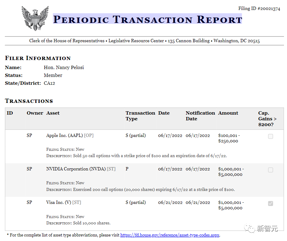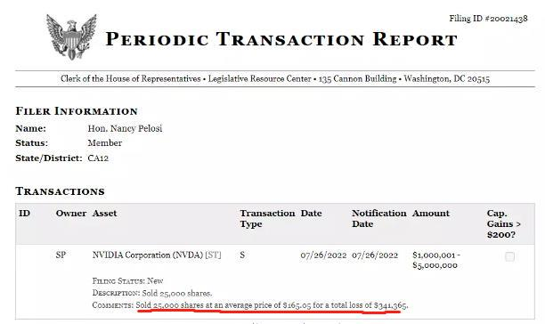 根据众议院Clerk of the House of Representatives公布的定期交易报告,保罗·佩洛西以约 410万美元的价格出售了25,000股英伟达股票,最终亏损341,365美元。
