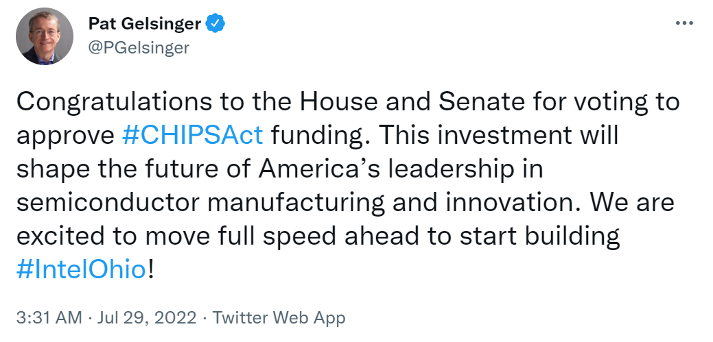 「祝贺众议院和参议院投票批准CHIPS法案的资金,」英特尔首席执行官Pat Gelsinger在投票后写道。