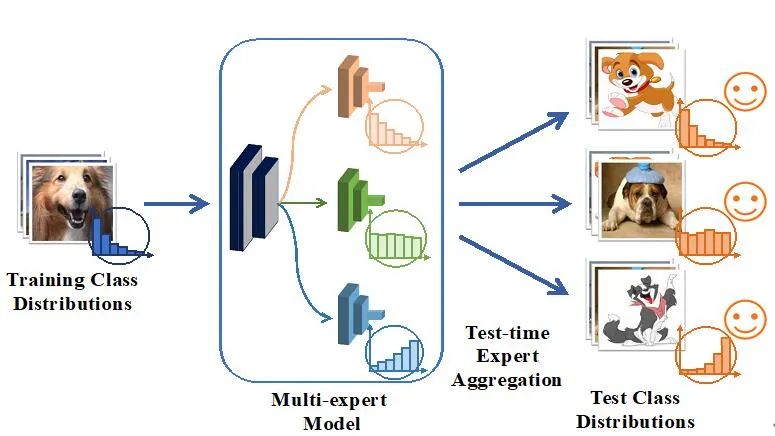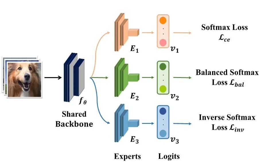 这一现象说明了通过不同方法得到的模型具有不同的技能特长,即擅长不同的类别分布。例如,Softmax 更擅长长尾分布,而 Balanced Softmax 更擅长均匀分布。基于这一发现,自然能联想到:如果能训练多个擅长不同类别分布的模型,并在测试场景下能够有效地组合它们,我们就能自适应地处理任何类别分布了!