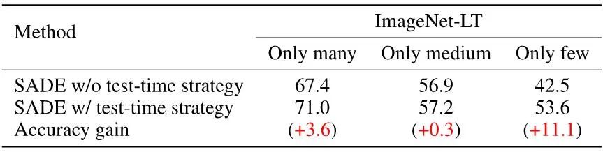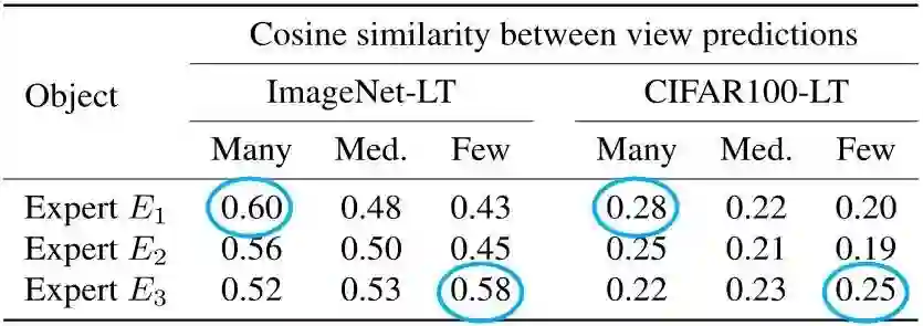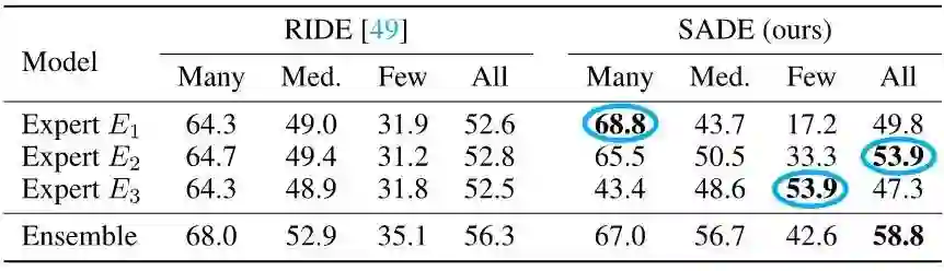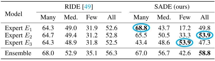 相较于之前致力于学习多个具有相同类别分布的多专家学习方法 RIDE,该策略能有效学习擅长不同类别分布的多专家模型,如下表所示。